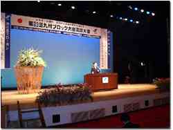 式典終了後は、ジェームス三木氏を講師に迎え、記念講演。しかし、ここで予定外のことが発生した。講師を乗せた飛行機が気候条件が悪く、こちらへ着陸できなかったのである。よって、記念講演は、やむなく中止されたものの、高鍋YEGの頼れるメンバーは、予定外のアクシデントはお手の物とばかりに、即対応し、急遽、鈴木会長の講話が設定され、おなじみの軽快でユーモアのあるスピーチを聞いた。