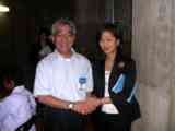 公開の記念講演はさすがに洗練された「プロジェクトX」の膳場貴子さんの初々しいお話でしたが、いやはや舞台裏では彼女を取り囲んだ記念写真大会で、広報では代表して小園会長との握手を取らせていただきました。