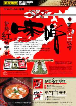 OIY味噌は平成12年に姉妹YEGとなった三重県伊勢YEGと共に「YEGらしくビジネスになる商品を共同開発しよう」と2年半の歳月を掛けて生まれた。味噌のように月日を掛けて姉妹YEGの関係を熟成させていこうという思いも込められているということである。帯広のO、伊勢のI、YEGのYを取ったOIY味噌というネーミングも面白い。帯広が白味噌、伊勢が赤味噌という紅白の色の組み合わせもインパクトがあり、また全国大会記念製作に相応しくおめでたい配色である。平成16年度のYEG大賞にも応募された事業である。