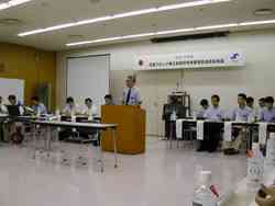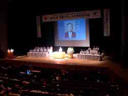 また、式典会場のホワイエでは吹田市産業労働室の協力で、物産品展示コーナーを設け、35社の物産品と商青連総務委員会よりエンジェルタッチを紹介するコーナーが設置され、大変賑わいました。さて、式典では、近畿ブロック商工会議所青年部連合会石井会長より歓迎の挨拶に続き、日本商工会議所全国商工会議所青年部連合会小園会長の挨拶で、全国400単会延べ3万人の仲間が横に繋がりそれぞれの地域でビジネスを通じ社会貢献することが、スローガンである“美しい日本の創造!”への第一歩であると力強く締め括られた後、日本商工会議所山口会頭よりビデオメッセージで参加者への激励を頂きました。