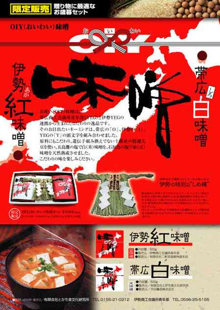 原料にこだわりぬいて、2年半の歳月をかけ、このOIY味噌が生まれ、帯広のO、伊勢のI、YEGのYを組み合わせ、両YEGの縁結びにふさわしいおめでたいネーミングにしました。