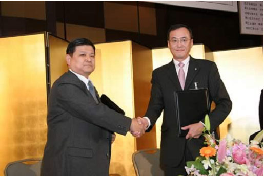 平成19年1月18日、岡山全日空ホテルにて岡山YEGと西大寺YEGとの合併契約調印式が執り行われました。岡山商工会議所岡崎会頭と西大寺商工会議所大森会頭のお二人を立会人としてお迎えし、両YEG会員・OB・報道関係者等計230名が見守るおごそかな雰囲気の中、廣野・山本両会長が合併契約書に署名捺印してお互いに交換した後、盛大な拍手に包まれながら両者がっちりと固い握手を交わしました。