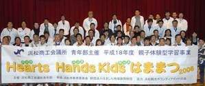 そして平成18年度、前年度の政策提言を基に自分たちにできることはないかを考え、全体事業として親子体験型学習事業『Hearts Hands Kids はままつ2006』を開催した。市全域より参加親子63組137名が参加し、青年部スタッフ70名・ボランティア23名の協力を頂き、午前中は市内14箇所をグループ別で歩いて回り、浜松の良いところや不便なところなどを体験し、冒険マップにシールを貼り、まとめたものを浜松市長に手渡した。子ども達から市長への「直接提言」だ。そして浜松の施設などを改めて体験して頂き、郷土浜松の素晴らしさを親子はもちろん、スタッフにも感じて頂いた。