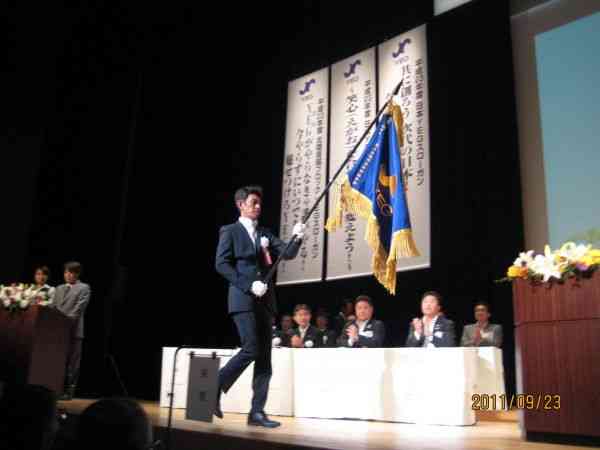 開会に先駆け、松本大会会長がブロック旗を掲げて入場