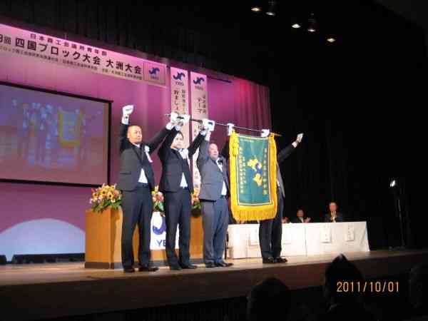 今年新調された四国ブロック旗の伝達・・・四国は一つの想いが三根生ブロ代から栗田次年度ブロ代へ引き継がれました。