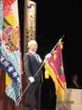 中谷ブロ代がブロック旗をもって登場。ステージ上は各府県連の大漁旗も並びました。(^^)