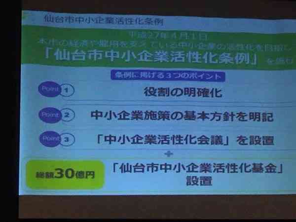 奥山市長に仙台市中小企業活性化条例などについてご説明をいただいた後、鈴木会長と対談形式で意見交換しました。