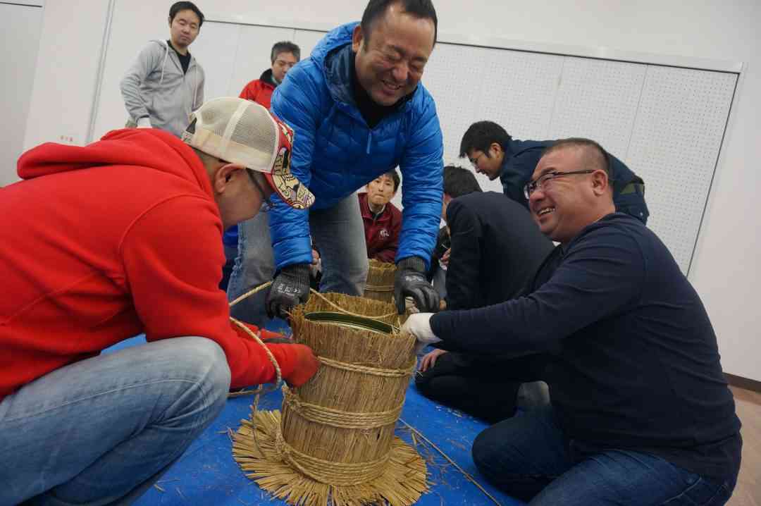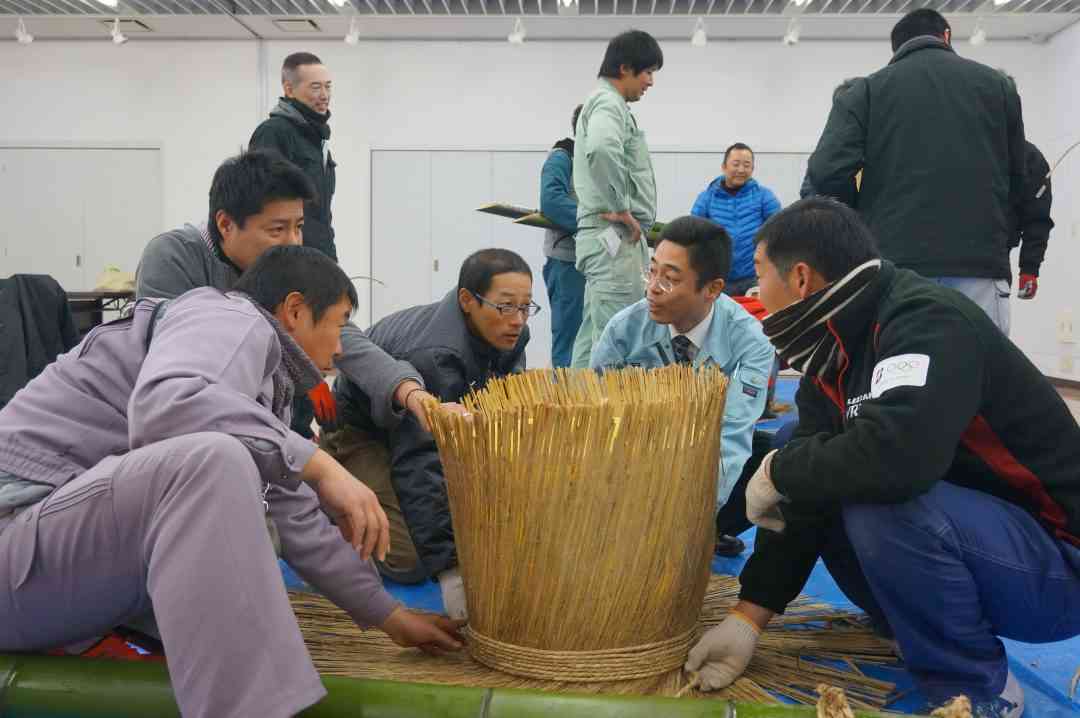 製作経験がないメンバーがほとんどでしたが、約2時間かけて、飾る位置や縄の巻き方や回数(下から七回、五回、三回巻)、また結び方(男結び)にこだわった4基の門松を完成させました。
