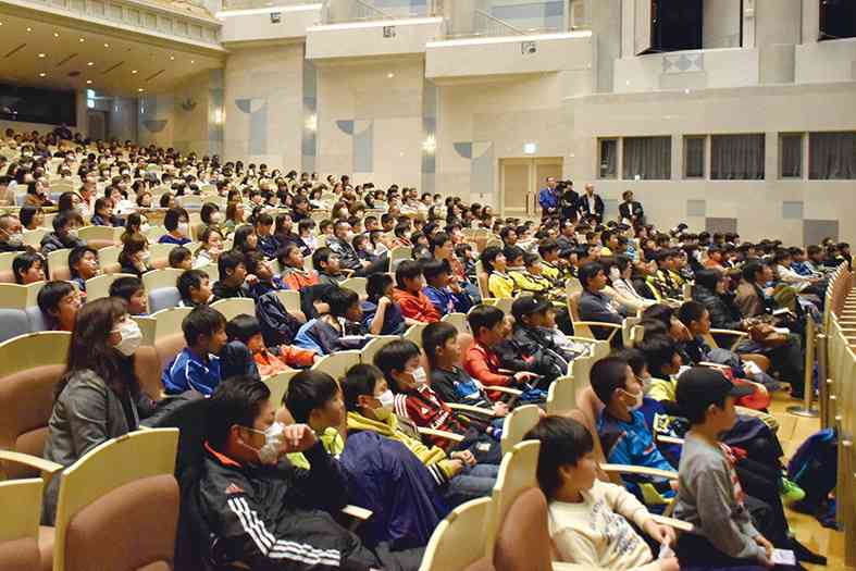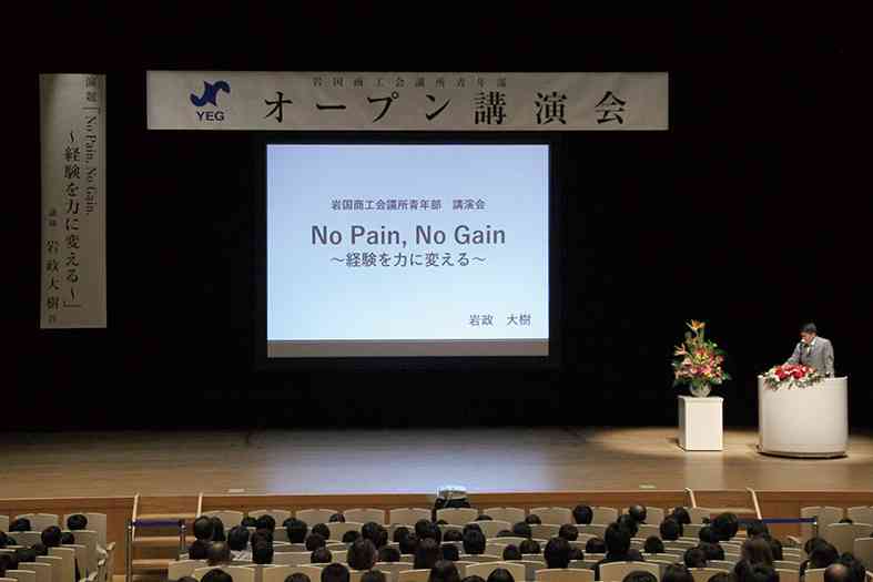 岩国YEG(152名)は1月9日、サッカー元日本代表DFで周防大島町出身の岩政大樹さん(35)によるオープン講演会を開催しました。「未来への挑戦!めざせ世界へ!はばたけ子どもたちよ!」をテーマに、トップアスリートの生の声を聞き、学んでもらおうと企画。会場のシンフォニア岩国コンサートホールは、小中学生や高校生を中心にサッカー指導者や保護者ら計800人で埋まり、来場者は熱心に耳を傾けていました。