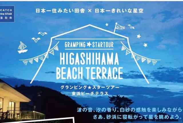 グランピング☆スターツアー「東浜ビーチテラス」は、「星取県」岩美町「東浜」を舞台に、おしゃれで快適なグランピングテントに泊まり、キャンプというよりむしろリゾート感覚でその空間を楽しんでいただくイベントです。日本一星のきれいな町で、美しい自然に囲まれて、おいしい食事を楽しみながら、都会にはないありのままの贅沢を心ゆくまでご堪能ください。