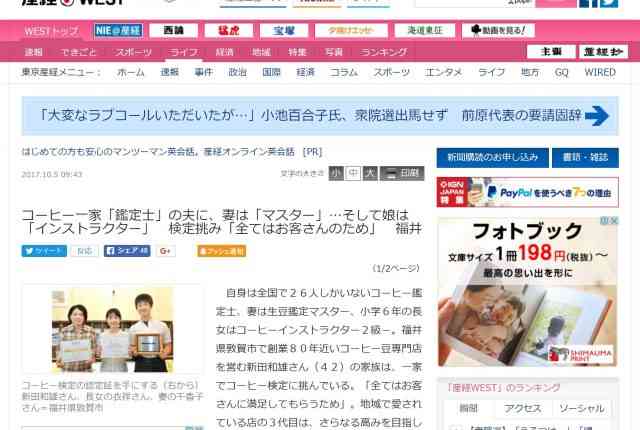 福井県連敦賀YEGの新田君が産経WESTに「コーヒー一家「鑑定士」の夫に、妻は「マスター」…そして娘は「インストラクター」 検定挑み「全てはお客さんのため」 福井として掲載されました。
