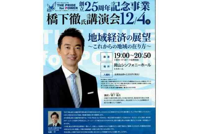 岡山YEGは、創立25周年を迎え記念事業を開催致します。本事業では弁護士、政治家、タレントと各方面でご活躍の橋下徹氏に「地域経済の展望~これからの地域の在り方~」という演目でご講演頂きます。地域を愛し、郷土岡山の発展に繋がるように、経営者として、YEGメンバーとして更なる成長を成し遂げられるように取り組んで参ります。