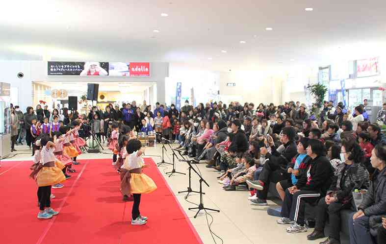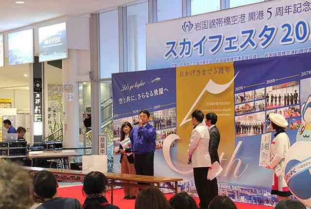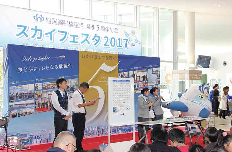 岩国YEG(151名)は12月10日、山口県東部の空の玄関口、岩国錦帯橋空港の開港5周年を記念した「スカイフェスタ2017」を開催しました。開港後から続ける恒例事業。空港ロビーを舞台に、かわいらしい園児たちの発表会をはじめ、全日空(ANA)のビンゴゲーム大会やヴィオール弦楽四重奏団による記念コンサート、岩国市出身の歌手、京太郎さんによるショーなど多彩なステージが繰り広げられ、延べ2000人の来場者でにぎわいました。