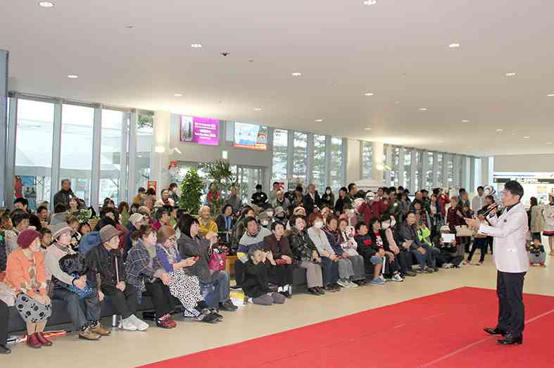 来場者に空港利活用についてのアンケート用紙に答えてもらい、半券を抽選券として終盤に行ったお楽しみ大抽選会にもたくさんの方に参加していただきました。景品は、岩国錦帯橋空港利用促進協議会に加盟する近隣市町の特産品をはじめ、カープ応援タオルや岩国の銘酒、そして、目玉として用意したANA賞と岩国YEG賞は「岩国ー沖縄往復ペアチケット」各1組ずつの計2組。抽選会には歌手の京太郎さんにもプレゼンターとしてご協力いただき、大いに盛り上がりました。