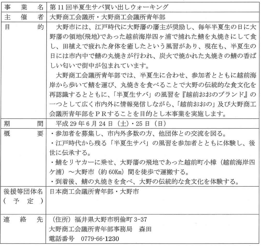 半夏生に合わせて、参加者とともに越前海岸から歩いてサバを運び、サバの丸焼きを食べることで大野の伝統的な食文化を再認識するとともに「半夏生サバ」の風習を『越前おおののブランド』を広く市内外に発信して「越前おおの」及び大野商工会議所青年部をアピールする。