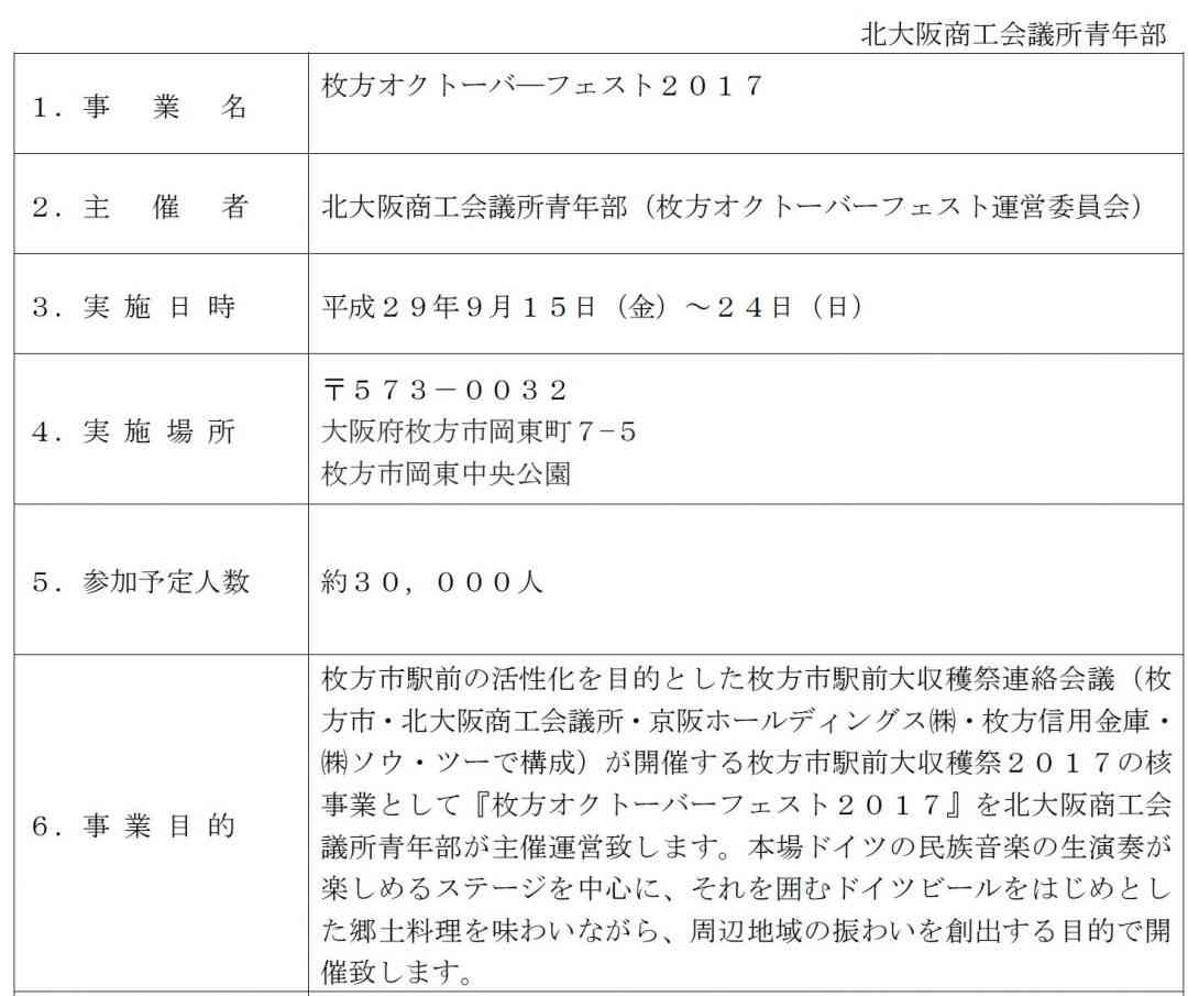 枚方市駅前の活性化を目的とした「枚方オクトーバーフェスト2017」、本場ドイツの民族音楽の生演奏が楽しめるステージを中心に、それを囲むドイツビールをはじめとし郷土料理が楽しめます。周辺地域は賑わい楽しい空間が創造されます。