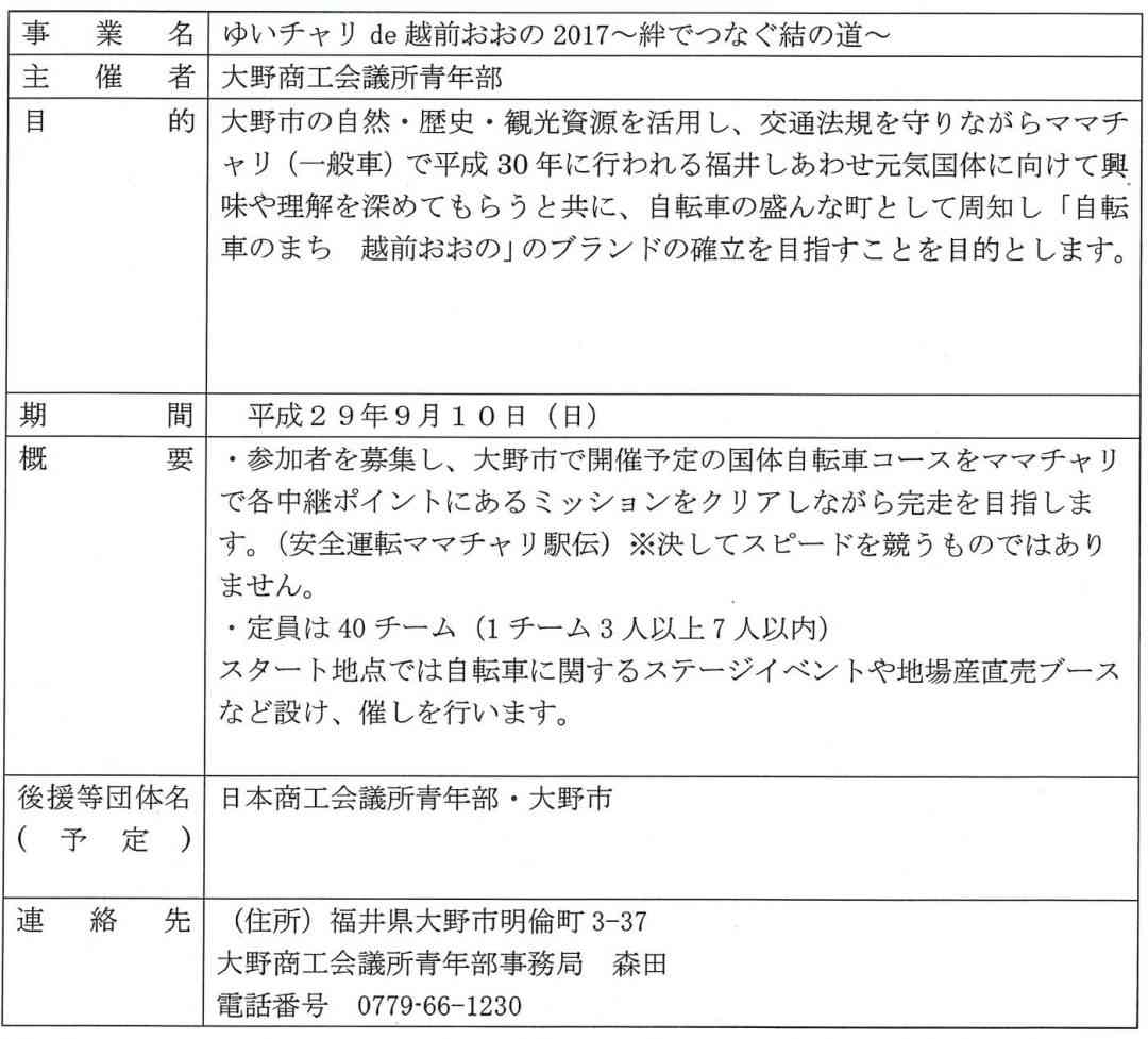 大野市の自然・歴史・観光資源活用し、交通規制を守りながらママチャリで走り、自転車の盛んな町として周知し、平成30年に行われる福井幸せ元気国体に興味や理解を深めてもらう。また、「自転車のまち 前おおの」のブランドを確立する。