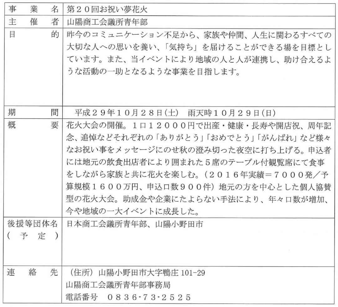 昨今のコニュニケーション不足から脱却すべく、感謝の言葉を彩る花火を家族とともに観覧して大切な人に気持ちを届ける事業です。また、地域の人々が連携して助け合いの気持ちを感じる事業でもあります。