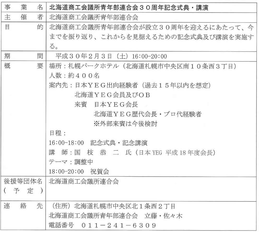 北海道商工会議所青年部連合会が創立30周年を迎えるにあたって、今までを振り返り、これからを見据えるための記念式典及び講演を実施する。