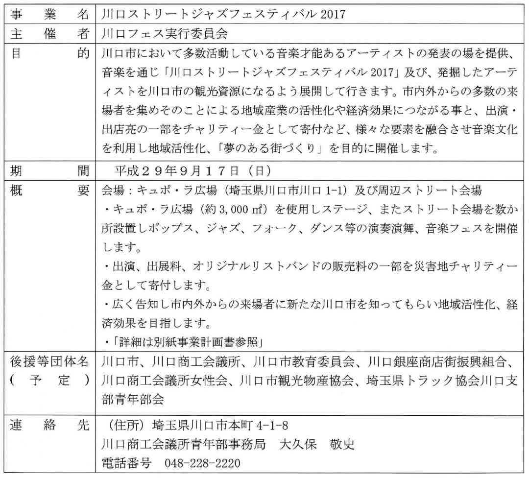川口市において多数活動しているアーティストの発表の場として開催。発掘されたアーティストを川口市の観光資源になるように展開していきます。そのことで市内外から来場者を集め地域の活性化につながることや、出演、出店料の一部をチャリティー金として集め地域に貢献する。