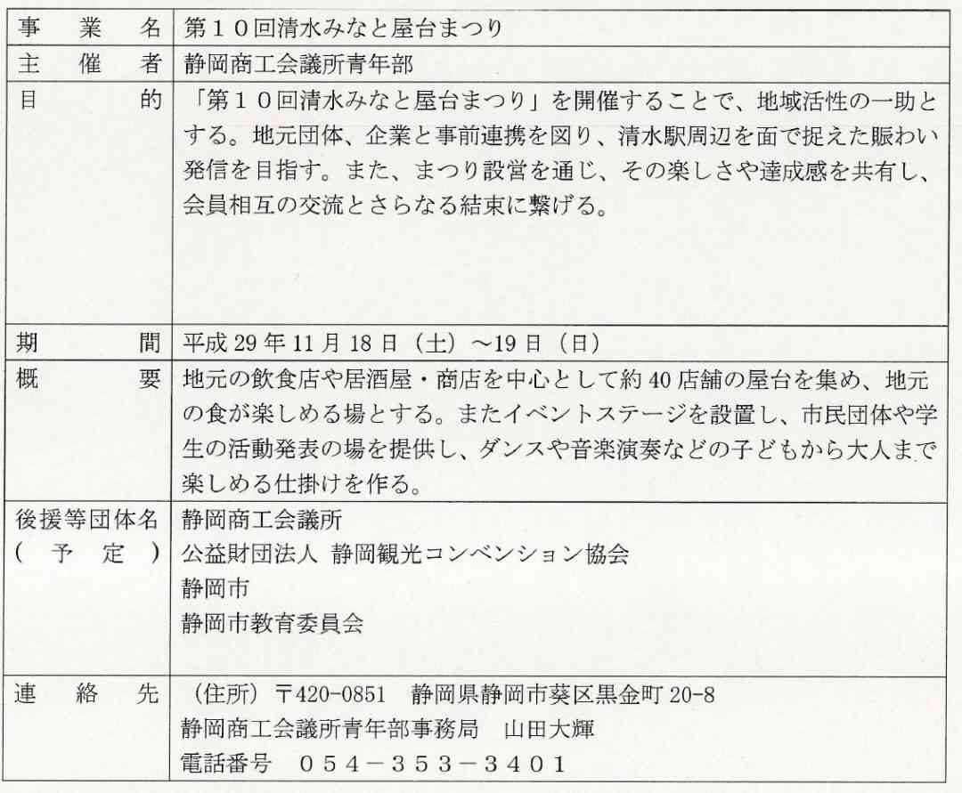 第10回清水みなと屋台まつりは地元の飲食店や居酒屋、商店を中心として40店舗の屋台が集まり、地元の食が楽しめる場となっています。開催に当り、地元団体、企業と事前連携を図ることでその楽しさや達成感を共有して地域活性化に繋げます。