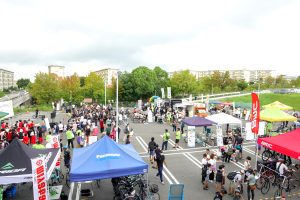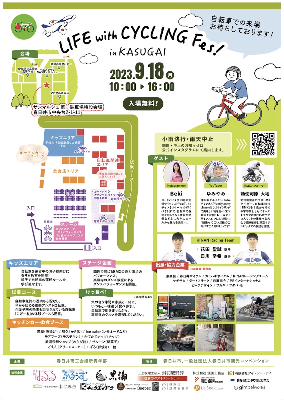 定例会のフェス会場は、高蔵寺のショッピングセンター駐車場を貸し切って開催し、ロードバイク、キッズバイクや高齢者専用自転車など多様な自転車を出展するだけでなく、キッチンカーや飲食ブースの出店、BMXパフォーマンスショーの開催など、幅広い層が来場しやすい環境を整えました。