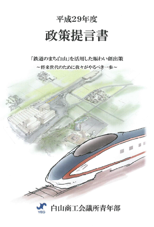 しかし、2017年に国が発足した「白山総合車両所を活用した産業観光の振興に向けたプロジェクトチーム」が設置される事になり、これまでの議論内容と単会内で作成していた要望案を取りまとめてきた成果である、政策提言書「『鉄道のまち白山』を活用した賑わい創出策~将来世代のために我々がやるべき一歩~」が完成し、白山市へ提出しました。