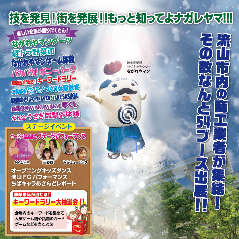 流山産業博は「流山市内の商工業者発展ならびに地域の活性化」を目的として、流山商工会議所青年部が企画・立案し、2003年度より流山商工会議所主催のもと毎年開催しているイベントです。
