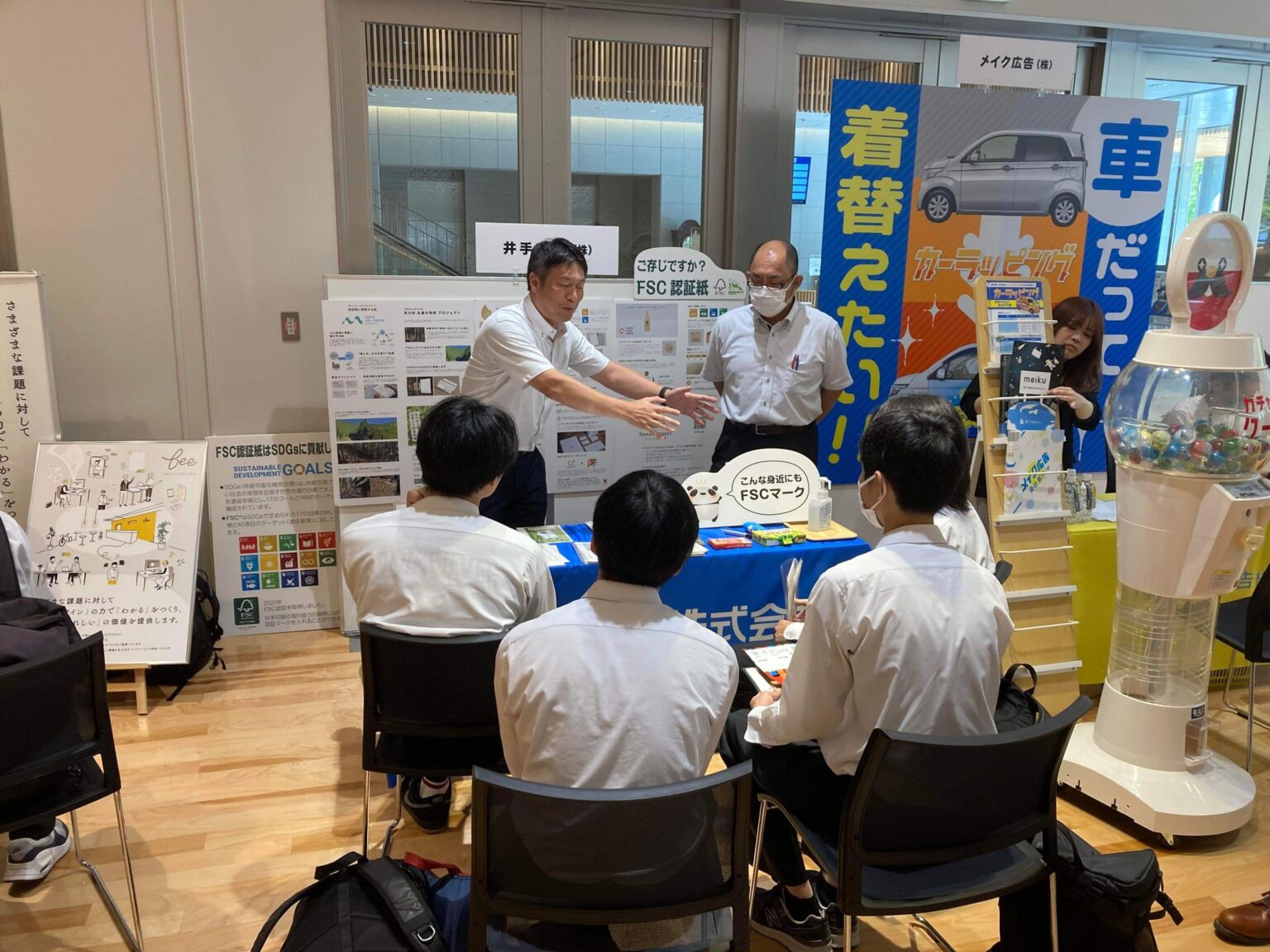 また事前に来場者対応と展⽰スキル、当⽇は講演を企画して学ぶ機会をつ くる。さらに就職が多い学校の進路指導や学⽣にも案内して、未来の雇⽤にもつなげる。