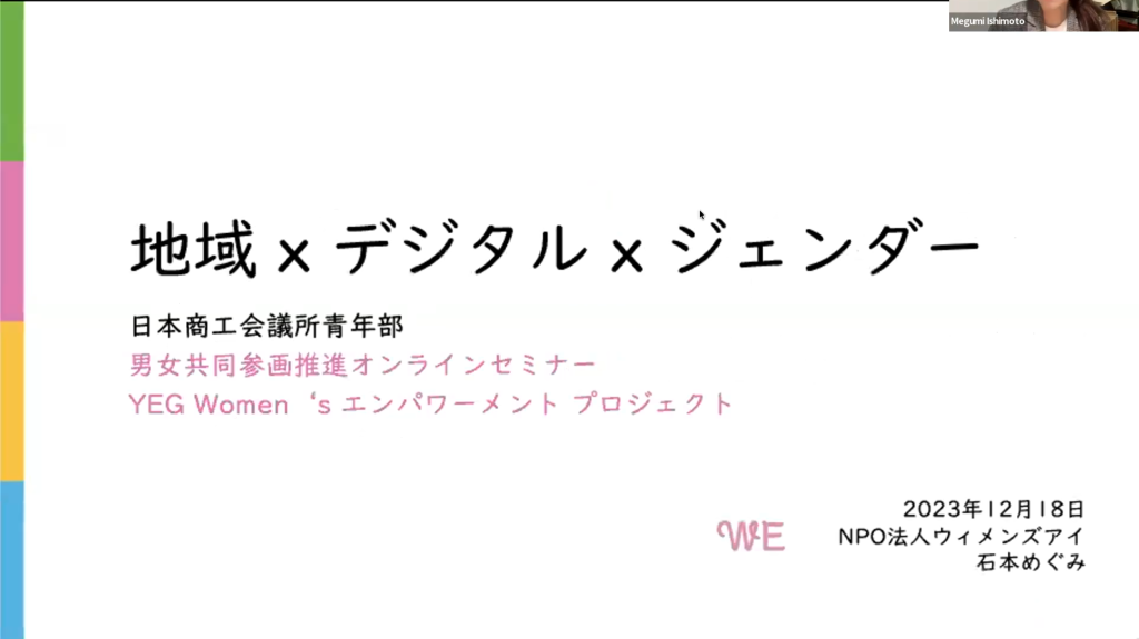 前半のセミナーでは、講師に特定非営利活動法人ウィメンズアイ 代表理事 石本めぐみ 氏をお招きし、「ローカル×デジタル ×ジェンダー」をテーマに講演していただきました。