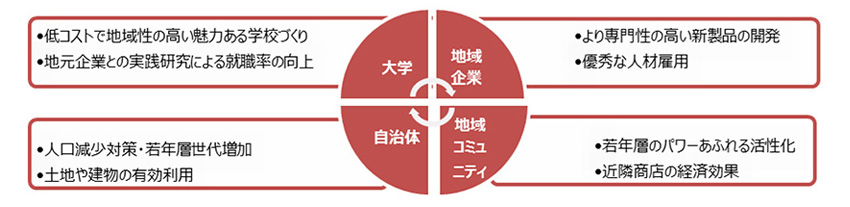 地方の人口流出の一つに進学・就職によるものがある。地元企業との強いパイプにより地元への就職、雇用にもつなげていくために、地元企業と大学の共同研究や事業による製品開発により大学での勉強が実践的になる。この様な魅力ある地方企業の情報発信を積極的に行うことで、地方の独自性を高めることができ、、地元愛を育むことができる。