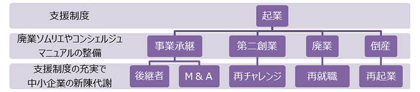 そのため、廃業ソムリエやコンシェルジュの設置やマニュアルの整備など、起業だけでなく事業承継や再チャレンジの方法もあるという選択肢を増やしていく必要があり、雇用の維持・確保、あるいは雇用創出を行うことを前提とした支援拡充を行うことで中小企業の新陳代謝を高め、地域活性化を推進する。