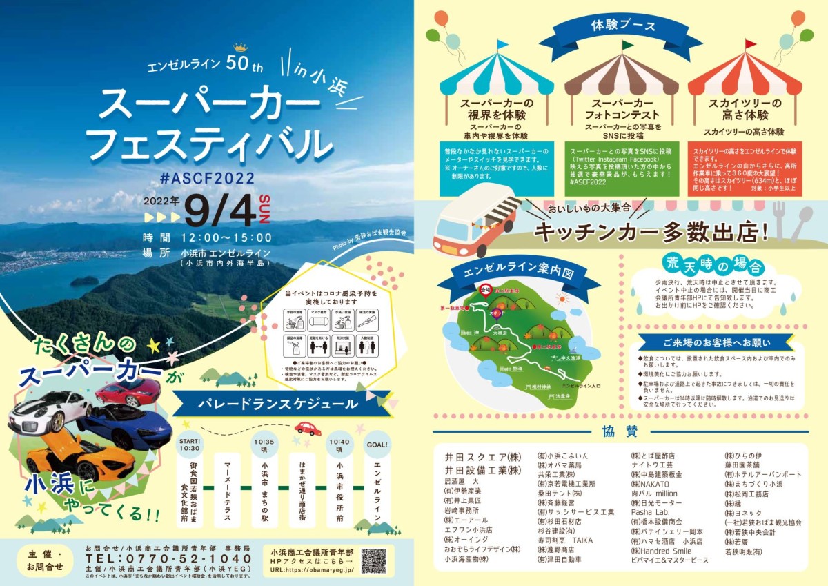 中地区 17Aug2022 小浜YEG エンゼルライン 50th スーパーカーフェスティバル in 小浜 ブロック:近畿ブロック 道府県連:福井県連 単会名:小浜YEG 事業名称:エンゼルライン 50th スーパーカーフェスティバル in 小浜 開催日時:2022年9月4日(日) 開催場所:エンゼルライン山頂駐車場 開催目的・内容: 開催目的:小浜市の地域資源の1つ「エンゼルライン」(ドライブロード)の良さを再発見すると共に、新型コロナ感染症の影響下でも楽しめるイベントを計画し、地域の賑わい創出に寄与することを目的として、スーパーカーフェスティバルを開催します。 開催内容:〇10:30~10:40頃 小浜市街地(川崎地区から千種地区まで)にて、スーパーカーのパレードラン 〇12:00~14:00頃 エンゼルライン山頂駐車場にて、スーパーカー フォトコンテストおよび車内見学 〇12:00~15:00頃 エンゼルライン山頂駐車場にて、高所作業車への乗車体験(大パノラマ体験) 〇12:00~15:00頃 エンゼルライン山頂駐車場にて、キッチンカー等による商品(飲食物)販売 ご参加・入場・駐車場等は無料ですので、9月4日は、ぜひ小浜市にお越しください。 詳細はこちら 小浜商工会議所青年部【公式サイト】 トップページ 中地区 豊橋YEG SDGsからのYouTubeでビジネス活性だよ!全員集合! 舞鶴YEG Maizuruアンブレラスカイプロジェクト 関連記事一覧 京都YEG/自企業よし!地域よし!京都市よし ~未来へ繋ぐ三方... 和歌山YEG/第一回ジュニアエコノミーカレッジIN和歌山 吹田YEG 公開事業「テクノロジーが切り拓く未来社会~変わりゆ... 小浜YEG/第1回 OBAMAわいわい フリーマーケット 新宮YEG 和傘の灯り2021~人と場所、未来へ想いを繋ぐ~ 近畿ブロック/真夏の大冒険~巡(めぐ)り会(あい)イン京都!
