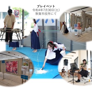 【プレイベントの開催】令和4年7月30日(土)13:00~15:30に、プレイベントとして、敦賀市役所1階オープンスペースおよびデッキスペースにて、書道パフォーマンス(8m×2mの紙に「敦賀市高校生合同文化祭TonTeen2022」の文字を書き、本祭の看板に)、ステージ発表(3組)を行いました。 同時開催で、生徒たちによる作品展示(美術部・書道部・生活情報科ドレス作品・建築システム科作品)を行いました。 プレイベント当日の様子はYouTubeにて配信 https://www.youtube.com/watch?v=CeU9UmWPJjY&t=3s