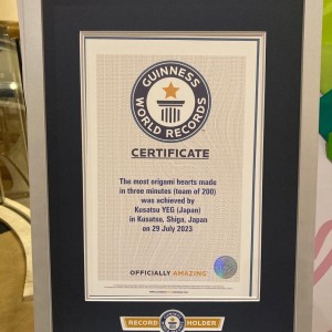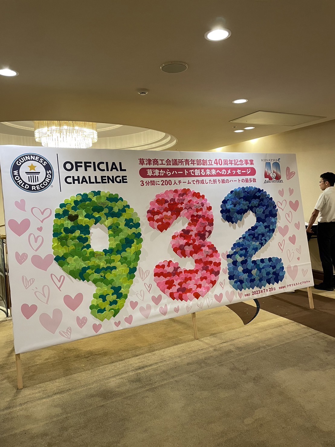 草津YEG40周年事業にて、記憶と記録と記念になる事業として企画し、周年参加者全てを対象として開催。参加者一人一人が、折り紙ハートを作成し、全員の個数を合算した数で、計測します。正式な折り紙ハートの完成形フォーマットを基準として、認定員が整形クリアしているかを審査されます。会場内に計測ブースを設け、公式認定員が審査、完成形だけを集計し、現行ギネス記録893個の折り紙ハートの記録を塗り替え、参加者180名で、目標としていた932個を大幅に上回る1009個という世界新記録を達成しました。事前に来賓参加者へ向けギネスチャレンジ練習用折り紙を作成手順動画とともに送付し、草津YEGメンバーは当日参加者にレクチャーできるレベルまで練習を行い、準備しました。結果、タイムアタック式ギネスチャレンジにおいて、それ自体が参加者同士の絆を深め、一体感や団結力といったパワーを生み出し、関係性を良好にし、新しい価値を生み出すことが出来ました。