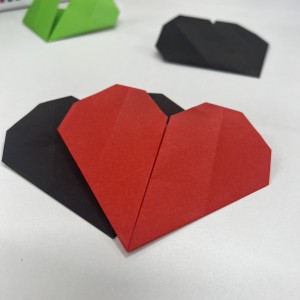練習で作成した折り紙ハートにメッセージを入れ、932というモニュメントを制作しました。