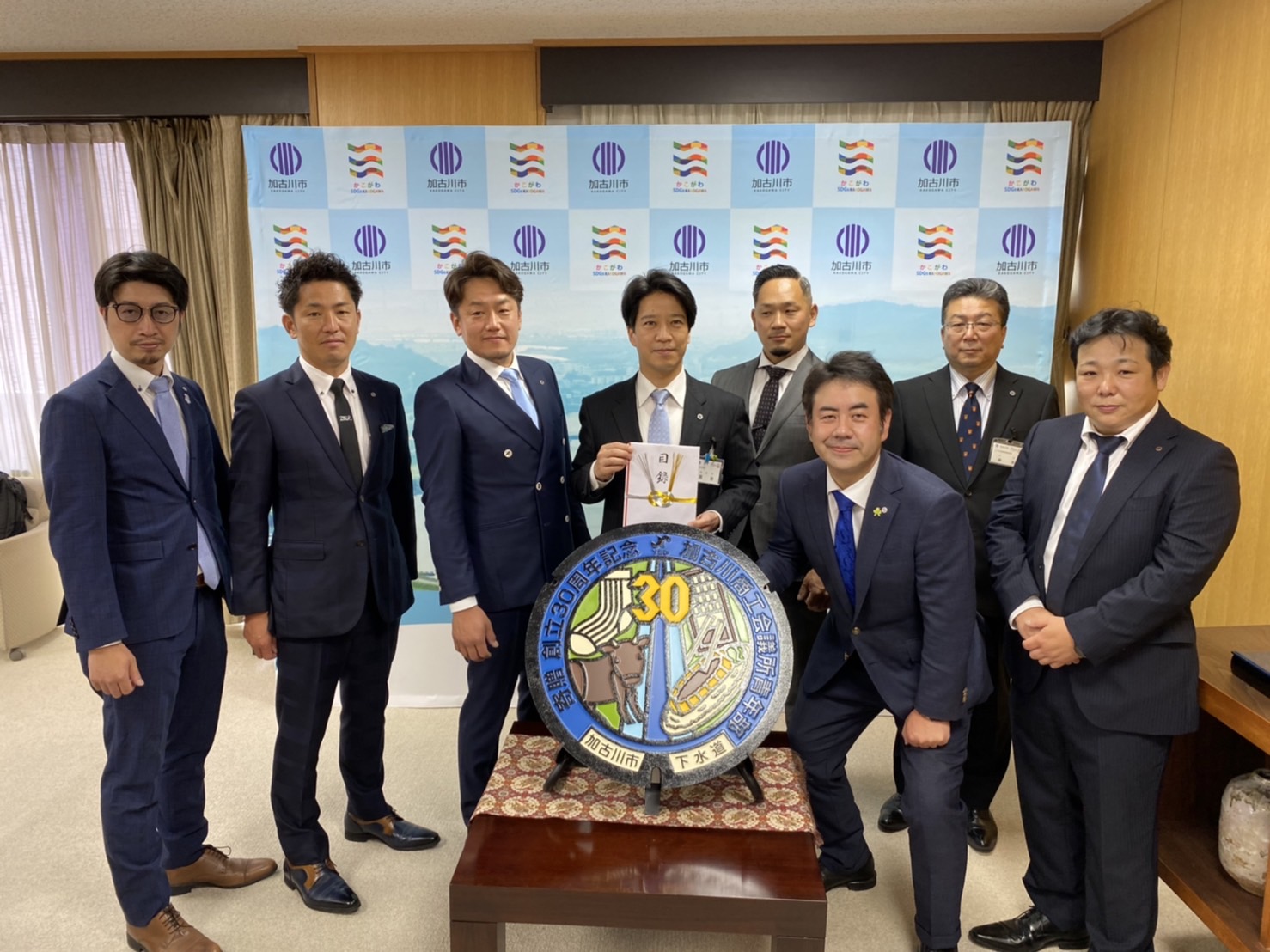 中地区 06May2022 加古川YEG 加古川商工会議所青年部 創立30周年記念品 デザインマンホール寄贈式 ブロック:近畿ブロック 道府県連:兵庫県連 単会名:加古川YEG 事業名称:加古川商工会議所青年部 創立30周年記念品 デザインマンホール寄贈式 開催日時:令和4年 4月 22日(寄贈式) 4月28日(設置式 開催場所:寄贈式(加古川市役所) 設置式(加古川商工会議所前マンホール) 開催目的・内容:私たち加古川商工会議所青年部は、令和3年度に創立30周年の節目を迎える事ができました。その記念品として、末永く加古川のシンボルとなるような、加古川の未来を見守る存在となるような何かを作りたいという想いでアイデアを出し合い、デザインマンホールを作成する事となりました。デザインマンホールはご存知の方もおられると思いますが、今、巷ではちょっとしたブームになっております。日本中のあちらこちらで地域をPRするために数々のデザインマンホールが作られ設置されております。私たちが作成しましたデザインマンホールもそのような存在となれれば幸いです。 作成しましたデザインマンホールは、令和4年4月22日に加古川市長岡田様、上下水道管理者井手上様、上下水道局の皆様にご出席いただき加古川市へ寄贈させていただきました。岡田市長様から「ユニークな贈り物をいただきました。」とのコメントもいただきました。そして、4月28日に加古川商工会議所正面玄関前の歩道に設置させていただきました。この場所で末永く加古川の未来を見守っていただきたいと願っております。 真ん中に加古川が流れており、名物(靴下、志方牛、国包建具、カツメシ)がデザインされています。 詳細はこちら https://kakogawa-note.com/kakogawa-news/20220428-design-manhole/ 中地区 九州ブロック商工会議所青年部連合会 故郷の新しい風会議 in 沖縄 豊橋YEG 豊橋商工会議所青年部5月事業「Positive Challenge! 豊橋YEG Story ~先... 関連記事一覧 大東YEG ⼤東市に新しい⾵会議 〜このまちの未来を⼀緒に考える〜 豊橋YEG 東三河交流会 前向きな挑戦~ミッション イン posit... 新宮YEG 和傘の灯り2021~人と場所、未来へ想いを繋ぐ~ 宇治YEG/地域交流事業 宇治商工会議所青年部 FESTIVAL マル... 鯖江YEG/9月地域活性化例会 〜さばコン サバエ横丁で出逢お... 愛知県YEG 令和4年度愛知県商工会議所青年部連合会ソフトボール...