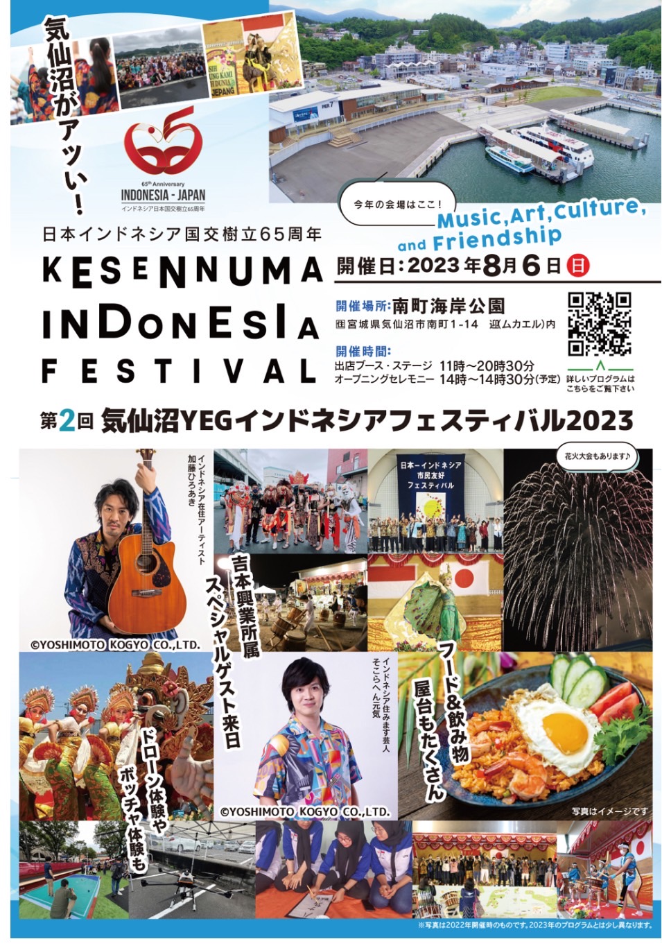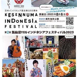 開催目的・内容:東日本大震災時に当時のユドヨノ大統領が気仙沼に訪問し、多大な災害復興支援を行なってくださいました。さらには、気仙沼市は2021東京オリンピック・パラリンピックでインドネシアの「復興ありがとうホストタウン」でもあります。そんなインドネシアの文化を気仙沼市の皆さまに知ってもらうキッカケを作るフェスティバル。 中でも切っては切れないのは、気仙沼の基幹産業を支えるインドネシアからの技能実習生。今も、これからも、彼らの存在は東北はもちろん日本で、そして、気仙沼市にとって必要不可欠な人材です。 2020年以降、世界中が困難な状況にあります。国境を超えて愛と友好、日本・インドネシアに共通する「祈り」の文化を通じ、御支援・産業のささえへの「感謝」、国境・宗教を越えた平和・友好への「願い」を込めて開催します。人口減少・人手不足が課題の地方にとって、多文化共生社会は課題解決の手段の一つです。持続可能な地域の発展に向けて『日本で一番インドネシアと交流のある町』気仙沼を目指し、選ばれる地域になることを目的とします。当日は、インドネシアパレードをインドネシア大使と共に行い、その後インドネシアフェスティバルを開催。主な内容は、インドネシア大使の挨拶に始まり、ステージにて現地の舞踊、会場内では来場したインドネシアの方に向けたチャレンジブースと称したテストマーケティング、そしてインドネシアで一番有名な日本人アーティスト『加藤ひろあき』さんのステージなどを行いました。 主催:気仙沼YEG 後援:在本邦インドネシア共和国大使館、ワンダフルインドネシア、国土交通省、東北地方整備局、東北運輸局、外務省、宮城県、気仙沼商工会議所、気仙沼市、(一社)気仙沼地域戦略、ガルーダインドネシア、株式会社菅原工業、インドネシア料理ワルンマハール 協力:吉本興業株式会社、東北大学公共空間ボッチャプロジェクト 協賛:地球対話ラボ、BLMTOUR、NOVUS JIVA、Ari TV、SRS Connect株式会社、気仙沼フカカツプロジェクト メディアパートナー:Akar Media