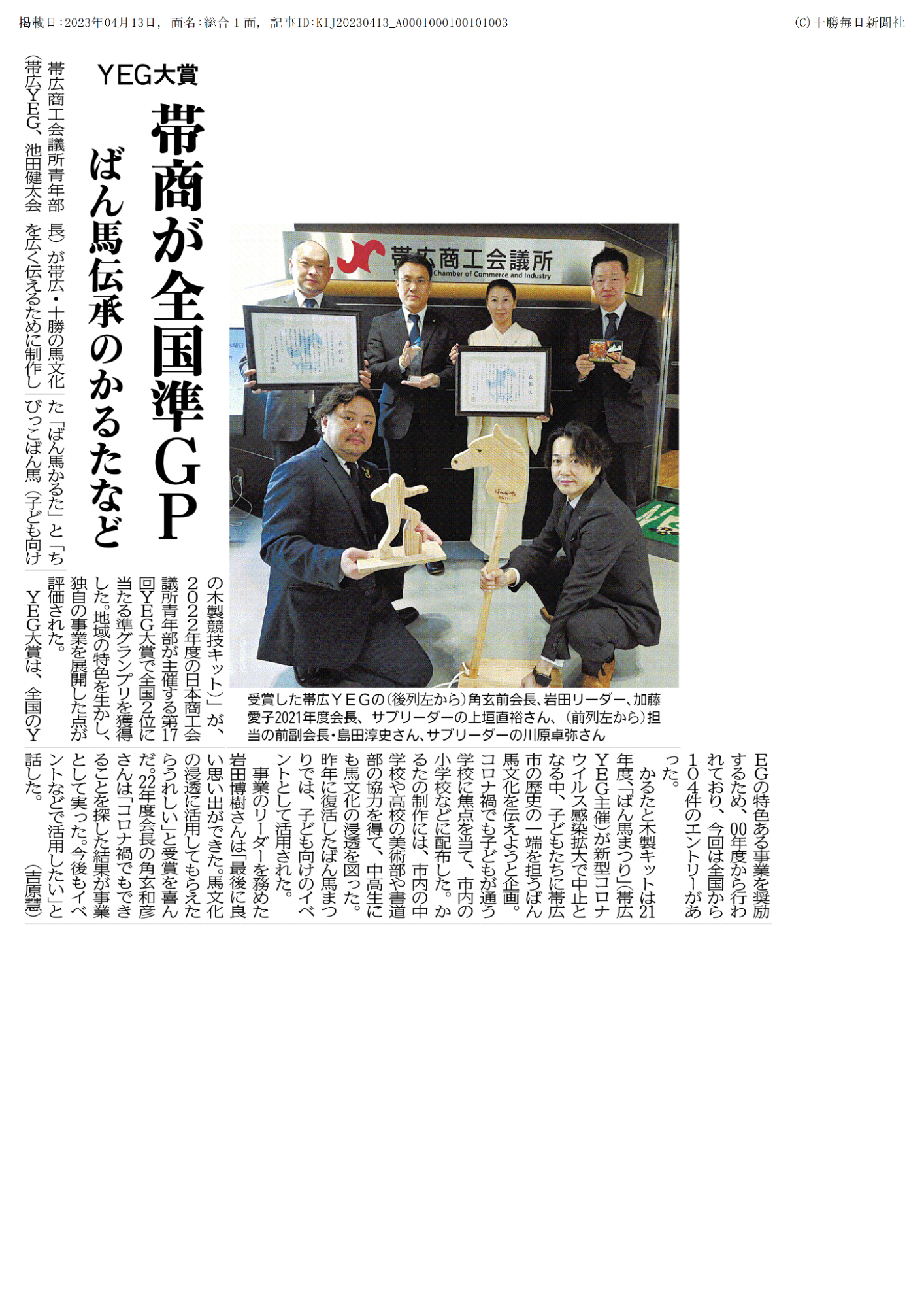 独自の事業を展開したことが評価され、地元新聞社に大きく取り上げて頂きました。また、とかちばん馬まつりにおいても、事業で製作した「ばん馬かるた」を配布することで、馬文化の歴史を振り返る一助になったものと感じています。