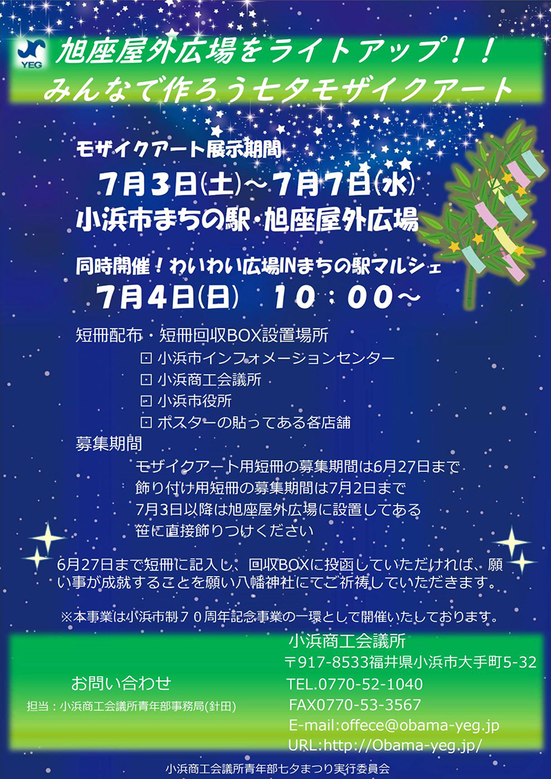 未分類 04Jul2021 小浜YEG 旭座屋外広場をライトアップ!! みんなで作ろう七夕モザイクアート ブロック:近畿ブロックYEG 道府県連:福井県連 単会名:小浜YEG 主催者名:小浜商工会議所青年部七夕まつり実行委員会 事業名称:旭座屋外広場をライトアップ!! みんなで作ろう七夕モザイクアート 開催日時:令和3年7月3日~7月7日 開催場所:小浜市まちの駅・旭座 開催目的・内容:昨年も当YEGが取り組んだ商店街の七夕飾り事業。 今年は期間限定のライトアップイベントとして市民の方々や観光客に楽しんで元気になって頂きたい。 また、七夕モザイクアートを展示する会場付近の集客・観光客増加を目的として実施しました。 今年も七夕まつり事業を実施することとし、小浜市民の皆様が願い事を書いた短冊をモザイクアート(横幅約10メートル 短冊5000枚使用 市のキャラクター さばトラななちゃん が浮かび上がるように)として展示しました。 また、竹を照明器具に加工し、七夕モザイクアートのライトアップを行いました。 展示期間 7月3日設置~7月8日撤去7月4日 日曜日は、展示させてもらっている「小浜市まちの駅旭座」の主催で「まちの駅マルシェ」を開催するとのことで、当YEGも参画して、オリジナル缶バッジ製作・配布コーナーを運営しました。 未分類 鳥取YEG 星取ビールプロジェクト 平塚YEG 7月定例会【まちかど広場プロジェクト】~歩み止めずTogetherしよう ぜ!~ 関連記事一覧 鳥取YEG 麒麟獅子紙芝居プロジェクト 紙芝居贈呈式 釧路YEG 釧路すえひろヒア(冷)ガーデン 武生YEG 「サ・ヨ・ナ・ラ」観覧車の前で菊傘回して踊ろっさ 村上YEG いいねっか村上2021 秋田YEG 令和2年度秋田商工会議所青年部 若手後継者育成事業 新居浜YEG ~自分らしく生きる~ LGBTQドキュメンタリー映画「...