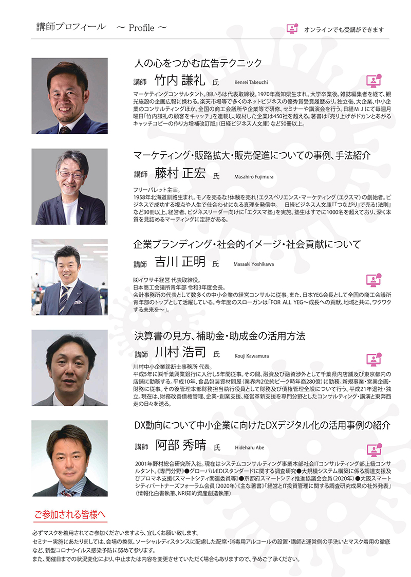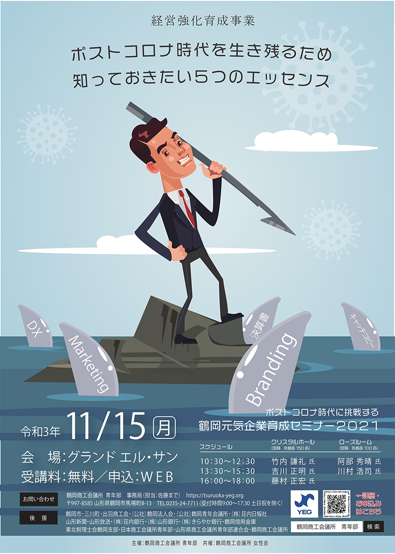 開催目的・内容:昨年より続いているコロナ禍の影響は、今までの生活を一変させました。人の動向が変わり今までの常識が通用しない状況にあります。現在、ワクチン接種が進んでいますが、未だ以前のような生活に戻れる状況ではありません。日本経済、地域経済の屋台骨を支えている中小企業及び小規模事業者は、このような社会情勢、地域の状況を鑑みるとコロナ前と同じ経営やコロナウイルスの収束を待つだけでは、経営の衰退の一途をたどることとなります。したがって、地元の中小企業、小規模事業者を対象に「ポストコロナ時代に挑戦する鶴岡元気企業育成セミナー2021」と題し、大規模セミナーを開催します。内容は、地元の中小企業者、小規模事業者、その従業員を参加対象とし、今後の事業をどのように継続し、発展していくかのヒントを得て頂くため、5つの分野に分けたテーマでセミナーを開催します。セミナーは、同日に同会場で行い、選択型、ハイブリット開催をすることにより、各々必要な情報を収集するために興味あるセミナーを選択して参加できます。
