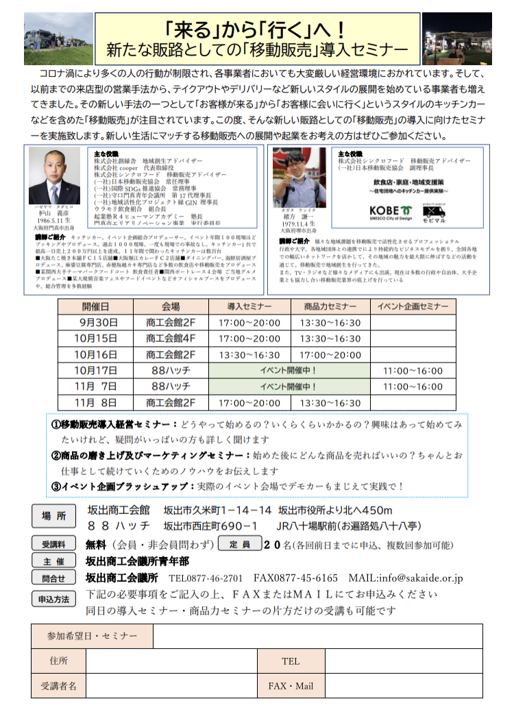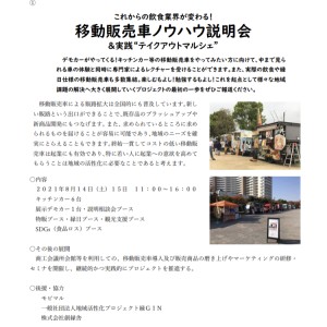開催目的・内容:コロナ禍における新しい生活様式の中で、様々な業種の販売業態は変化せざるをえず、そのうち移動販売というかたちは大きくその数をのばしている。飲食のみならず、ほとんどの業種にとって導入可能なかたちであり、イニシャルコストのハードルも低いことで非常に注目されている。