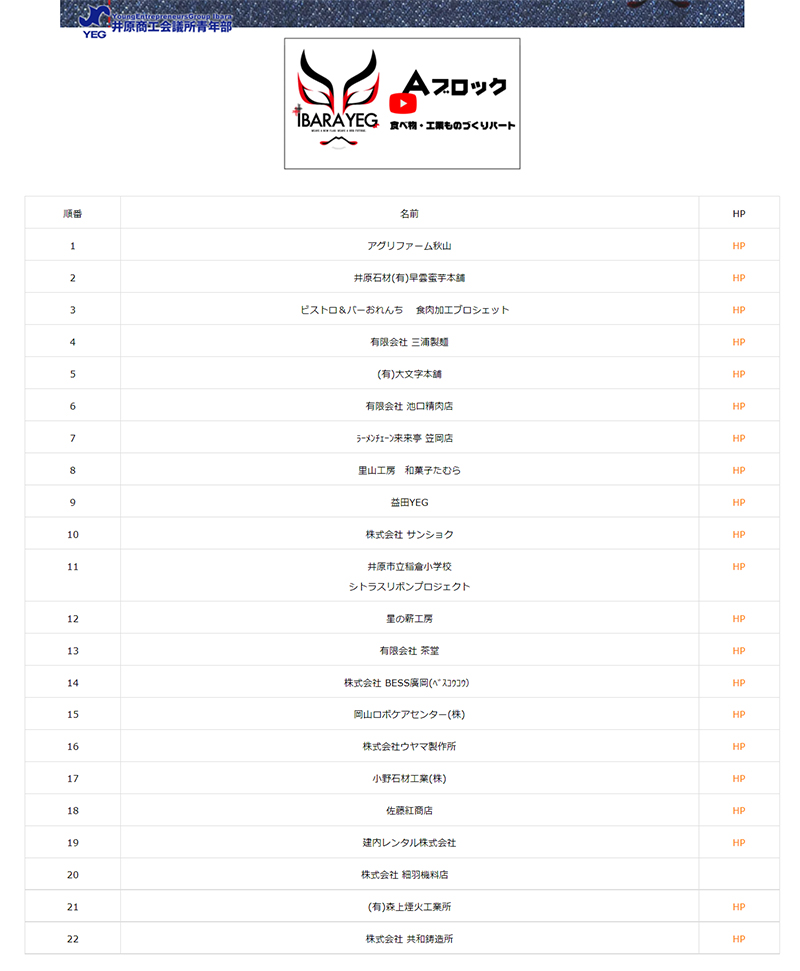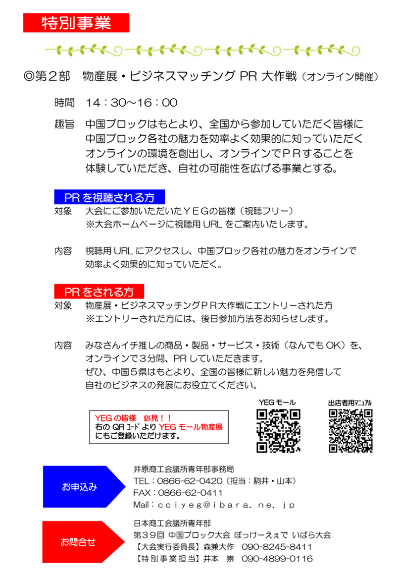 未分類 18Oct2021 井原YEG 物産展・ビジネスマッチング PR 大作戦(オンライン開催) ブロック:中国ブロックYEG 道府県連:岡山県連 単会名:井原YEG 事業名称:物産展・ビジネスマッチング PR 大作戦(オンライン開催) 開催日時:10月16日 14:30~16:00 開催場所:井原市地場産業振興センター 開催目的・内容:中国ブロックはもとより、全国から参加していただく皆様に中国ブロック各社の魅力を効率よく効果的に知っていただくオンラインの環境を創出し、オンラインでPRすることを体験していただき、自社の可能性を広げる事業とする。 未分類 彦根YEG Hikone Work Academy 善通寺YEG 乃木うどん復活事業 関連記事一覧 村上YEG いいねっか村上2021 徳島YEG 『徳島YEGのあきないラジオ』のご紹介! 明石YEG 第二回 あかしおしごとキッズ 流山YEG VR流山産業博 府中YEG HAPPY SUNDAY MAEKET 伊予YEG YEGの絆 in Zoom ~災害連携グループ情報交換会~