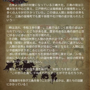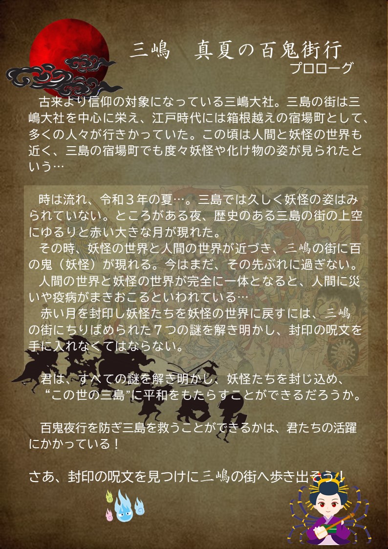 背景ストーリーは「赤い月とともに三島の街中に妖怪が現れた。この妖怪たちを封印するために、封印の呪文を見つけよう」となります。参加者は三島市街地にちりばめられた7つの謎を解き、封印の呪文を見つけ出し、妖怪たちを封印することが目標になります。事業名にある「百鬼街行」とは、百鬼夜行をもとに作った造語で、数多の妖怪が三島の街を昼夜問わず練り歩くイメージです。
