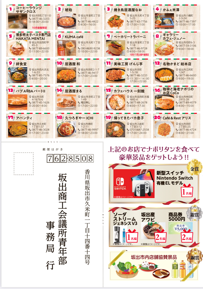 応募いただいた方の中から抽選で1名様にゲーム機(金賞)を5名の方に坂出名産品等(銀賞)をそのほかの方には我々青年部メンバーや商工会議所会員の方からご提供いただく商品(銅賞)を差し上げる内容となっております。