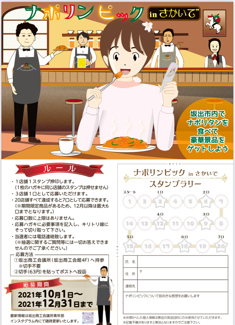 例年当青年部事業として9月に開催している駅前イベントである「バルinさかいで」がコロナの影響で2年連続で開催できないなか、同じくコロナの影響で打撃を受けている市内飲食店を盛り上げるイベントはないかと考えたのが「ナポリンピックinさかいで」です。オリンピックイヤーとなる今年とナポリタンを掛け合わせたネーミングとなっております。当事業を通じて「ナポリタンの街さかいで」のイメージを定着させ、地域の発展に寄与することを目的としています。
