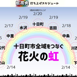 条地域:みよし台付近 15日(月)松代地域:松代総合体育館グラウンド 16日(火)川西地域:十日町市立川西中学校グラウンド 17日(水)中里地域:十日町市立中里中学校グラウンド 18日(木)中条地域:笹山球場近隣 19日(金)水沢地域:十日町市立水沢中学校グラウンド 吉田地域:南鐙坂付近20日(土)十日町地域(※3箇所同時打ち上げ): 十日町市立南中学校グラウンド十日町市立西小学校グラウンド 十日町市立東小学校グラウンド