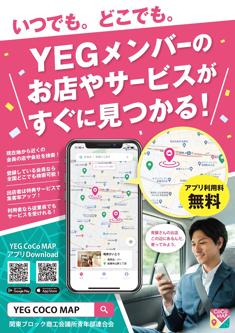 未分類 03Nov2021 相模原YEG ビジネス活性化ツール『YEG CoCo MAP』リリース ブロック:関東ブロックYEG 道府県連:神奈川県連 単会名:相模原YEG 事業名称:ビジネス活性化ツール『YEG CoCo MAP』リリース 開催日時:令和3年11月1日~ 開催場所:スマートフォンアプリ 開催目的・内容:今年度 関東ブロックが目指しているビジネスマッチングを加速させるために、ビジネス活性化ツールとしてスマートフォン用アプリ『YEG CoCoMAP』をリリースしました。 このアプリは常日頃から手元に常備することが当然になっているスマートフォンで容易にYEG会員企業の店舗や会社を検索することができます。他地域に行った際のYEG会員のお店に行きたい! 他地域での仕事を発注したい!などビジネスマッチングに役立つツールになっています。 YEGはCoCoにある!ぜひご活用ください! 未分類 霧島YEG 霧島市GoTo選挙キャンペーン 宮崎YEG Yポイントたまーるキャンペーン 関連記事一覧 鈴鹿YEG 鈴鹿まるごと応援券 すずまる 小野田YEG おのだ七夕祭り2021~みんなのために おうちででき... 新居浜YEG クリーン・ビーチ新居浜 ~拾えば街が好きになる~ 阿南YEG 第18回親子で冒険!!シーカヤック&SUP体験 船橋YEG 友好ビールを広めたろうぜ!プロジェクト 仙台YEG 医療従事者応援事業「ありがとうプロジェクトin仙台」