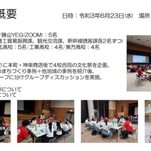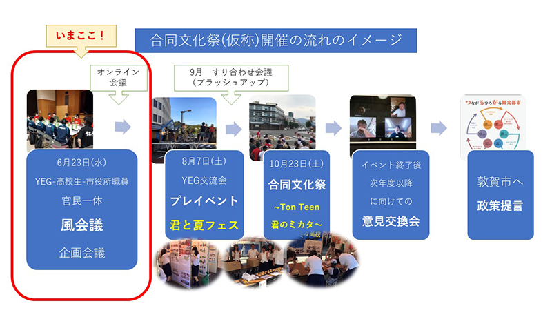 今回の事業では、企画段階から高校生に携わってもらい、地元の活性化、まちづくりを自分事として認識してもらい、将来の地域を支える担い手の発掘と育成することを目的に、文化祭の内容を検討する、YEG・敦賀市役所若手職員・高校生による「風会議」(議題は文化祭の名称・各校の出し物について)を6月23日(水)に開催いたしました。