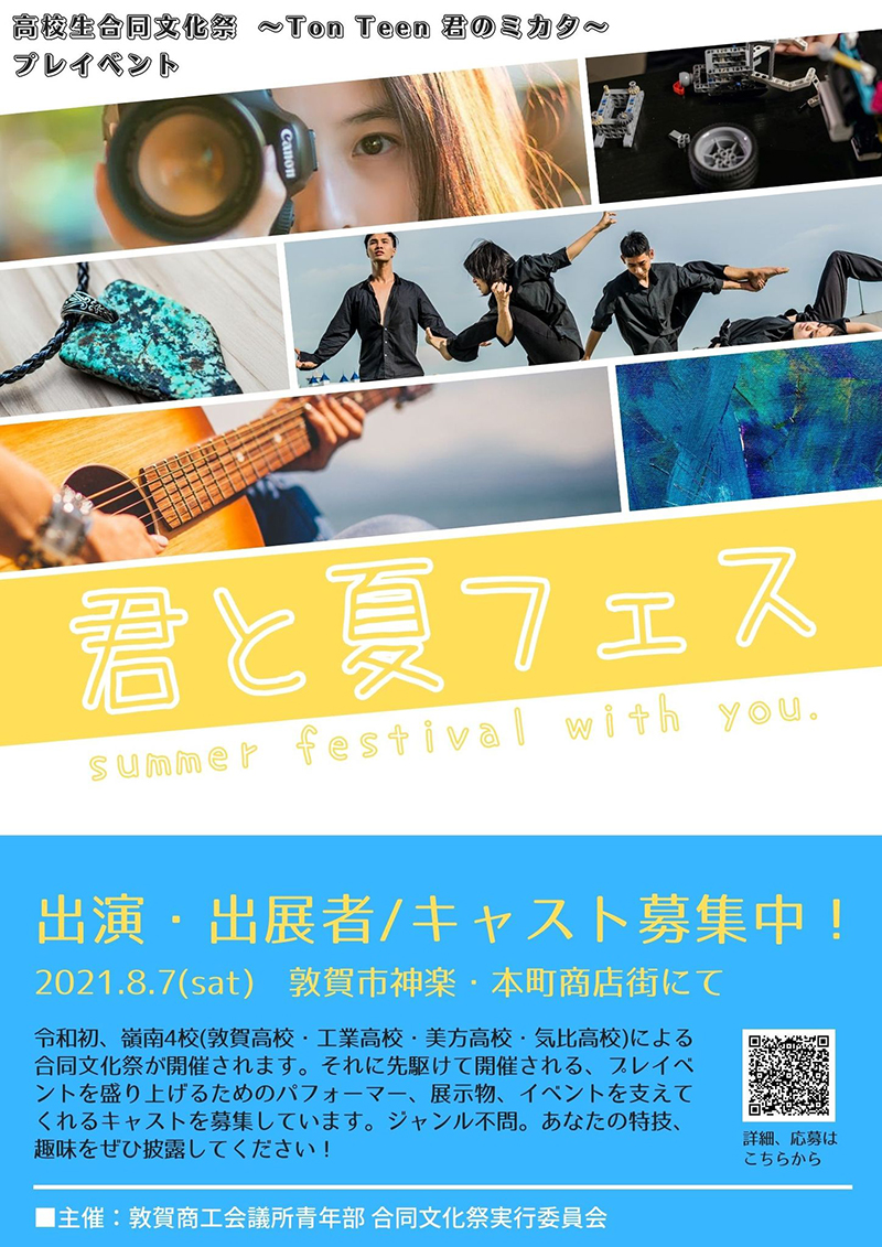 そして、敦賀の「活性化」と高校生による運営を通し「キャリア教育」に繋げ、将来のまちづくりに対する「想い」を感じてもらい、『敦賀の魅力』を再認識するきっかけとなるイベントを開催したいと考えております。